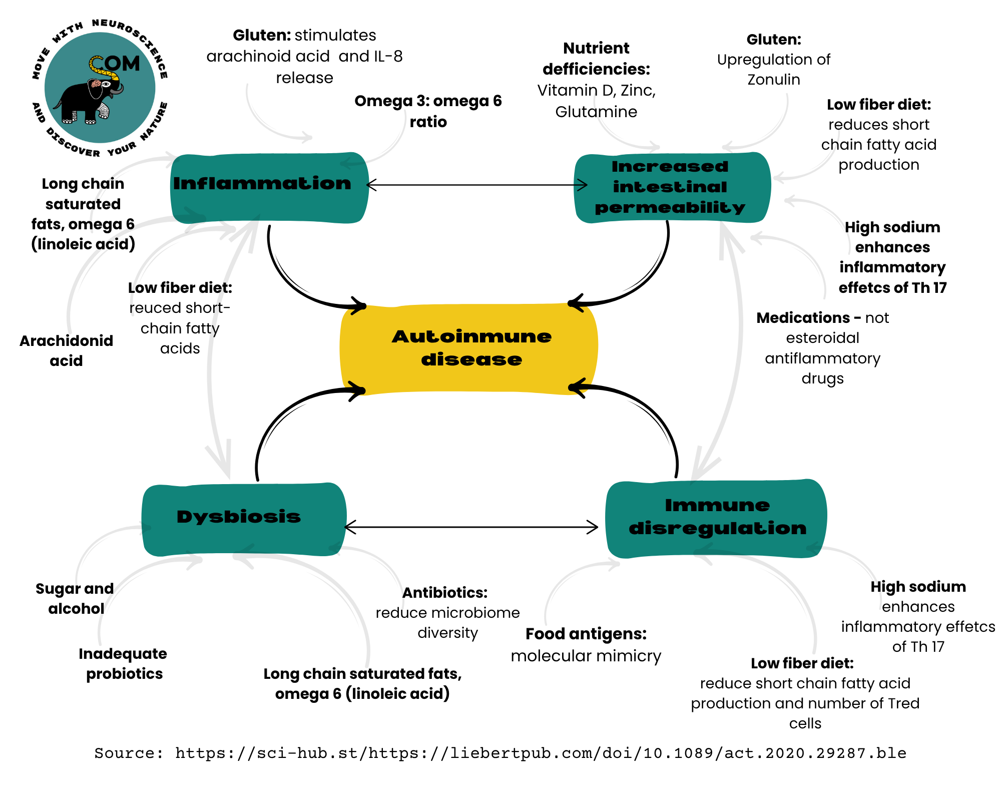 Chronic low-grade inflammation is the common thread linking stress, dysbiosis, leaky gut and autoimmunity. Microbial products crossing the gut barrier stimulate inflammatory cytokines such as IL-8, TNF-α and IL-17, and this inflammatory tone supports the perpetuation of autoimmune disease. Simultaneously, nutritional deficiencies (e.g., in vitamin D, zinc, glutamine), high-sugar/low-fiber diets, and lifestyle habits add fuel to this fire, amplifying intestinal permeability and immune activation. PubMed+1