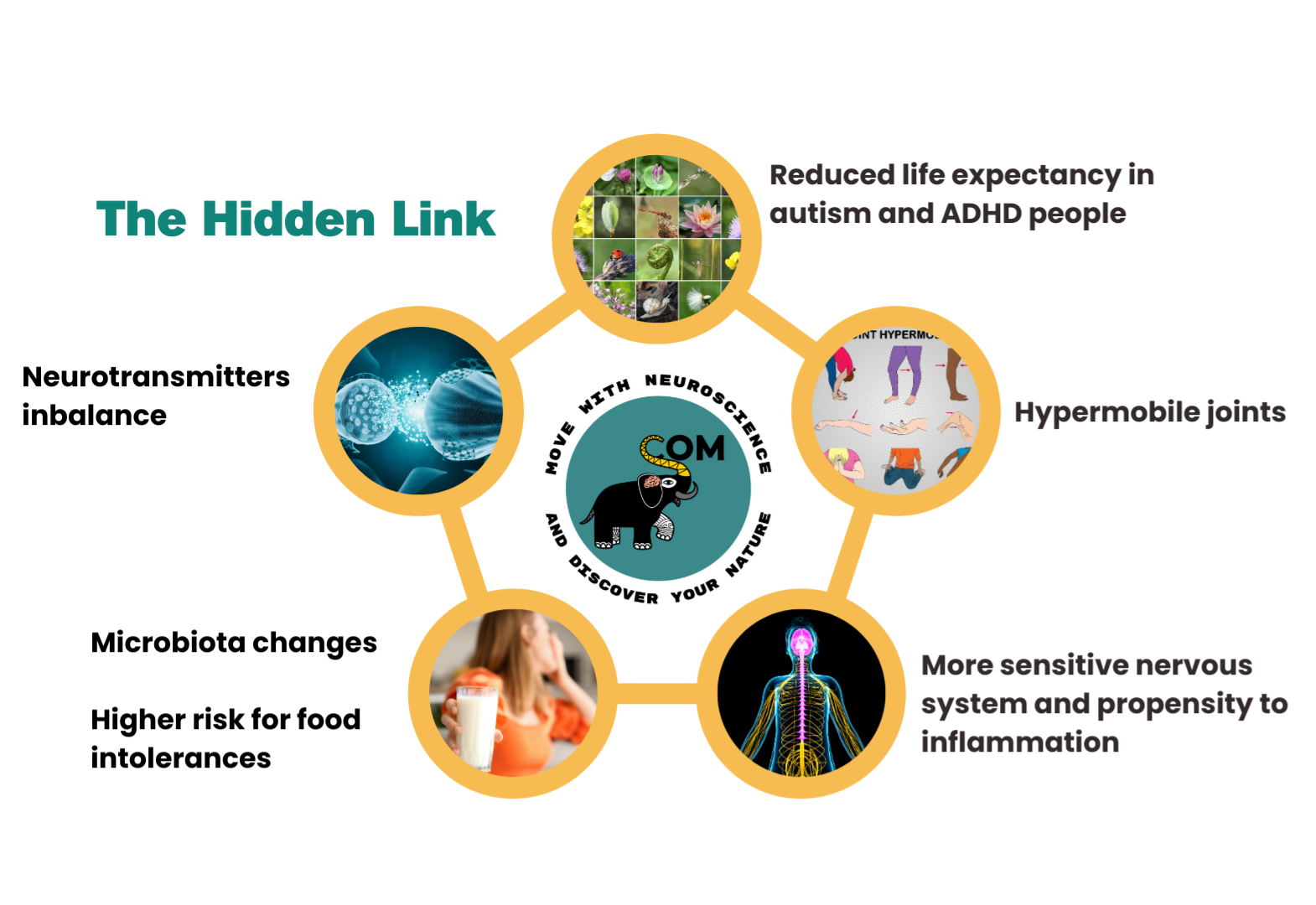As you can see on the image (neurotransmitter imbalance, hypermobile joints, microbiota changes, nervous system sensitivity) captures many of these overlapping influences. Here’s how they interact: